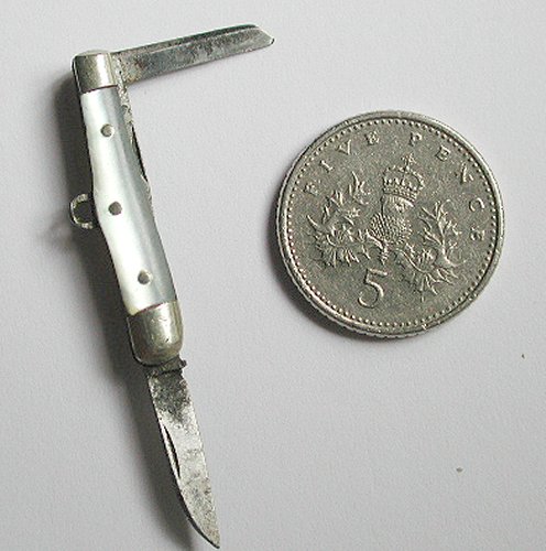 Very unusual minature, 2.5cm by 6mm, really superb quality, with Mother of Pearl and nickel casing.  Having 2 steel blades, the conditions of which are superb,apart from a small amount of verdigrises, consistant with the age.