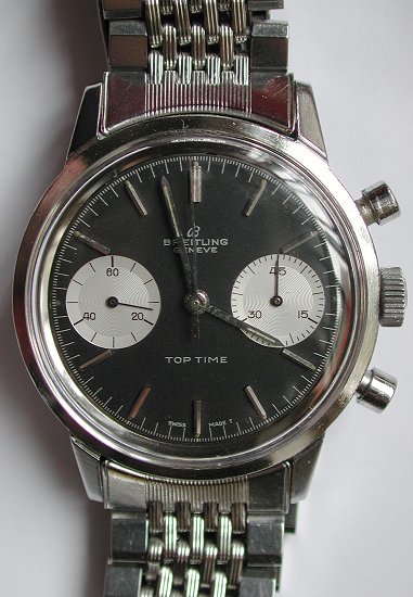 Classic model, Breitling Top-Time hand wound mechanical two register chronograph dating from around 1960, the watch consisting of, mint condition original black dial, with silver chronograph registers, silvered hands and silvered baton style hour markers, stainless steel case. The watch on associated stainless steel 1960'S bracelet, although the watch could also be fitted with a leather strap.