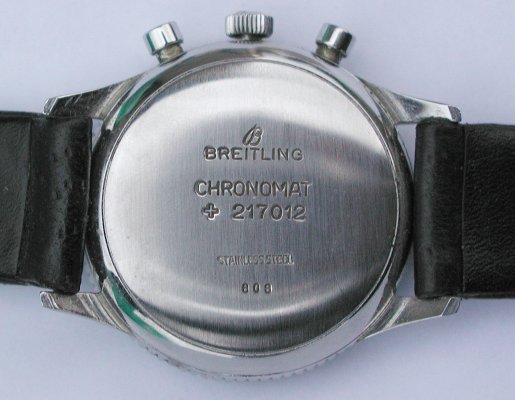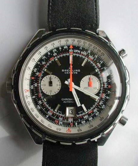 Classic rare model, massive Breitling Chronomat automatic mechanical two register chronograph dating from 1972, the watch consisting of, mint condition original black dial with outer tachymetric scale on inner bezel and aperture for date at 6 O`clock, with silver chronograph registers, white, red and black hands and luminous baton style hour markers, stainless steel case with rotatable bezel. This watch comes with the original instruction booklet and guarantee certificate from 1972 and has recently been subject to a full service by Breitling at  a cost of over £200 and is still under warranty and also has a Breitling case with it. These larger 1970'S Breitlings seem to be getting very collectable at the moment and a better example than this would be very hard to find