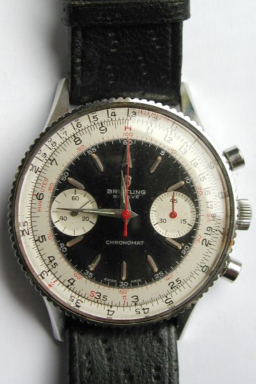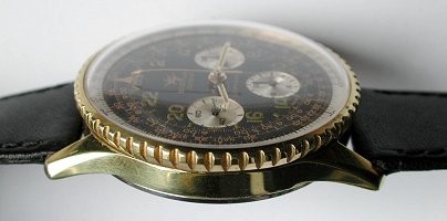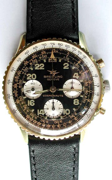 Rare classic 1960'S Breitling Cosmonaute 809 model hand wound mechanical 3 register chronograph with 24 hour dial. The watch consisting of mint condition untouched original dial (normally they are disoloured or showing its age over this period of time) which is black with three subsidiary dials for the chronograph. The dial marked out in 24 hours instead of the usual 12 hours and the time is read as it appears on the dial as an example at 12 p.m. both the hour and the minute hand are at the 6 o clock position. The watch with rotatable slide rule bezel and in a gilt case with stainless steel snap on back. This watch is in fabulous original condition throughout,the only wear showing is on the gilding on the original winding crown . The Breitling Cosmonaute went into space onboard the Aurora 7 on Lt. Commander Scott Carpenter's wrist in 1962 during Mercury Mission MA-7. While Richter's book mentions the watch "being run through extreme tests by NASA" prior to Carpenter's mission, other sources indicate that Breitling made the Cosmonaute for Carpenter and he personally chose to wear it.