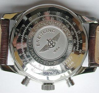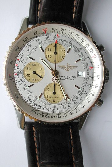 Gents stainless steel and gold Breitling Navitimer Automatic self-winding chronograph.  The watch consisting of silvered dial, with three subsidiary dials, one for 12 hour recording, one for 30 minute recording and one for continuous seconds.  Aperture at 3 o'clock for date, and tachymetric inner bezel.  The watch in stainless steel case, 18 carat yellow gold rotatable bezel, and 2 push buttons for operating the chronograph. The watch with gilt and luminous hands. The watch in very good hardly used condition throughout.  The watch on Breitling crocodile skin padded leather strap which retail at £200 comes complete with Breitling box and outer box. Click here to see the back of the watch