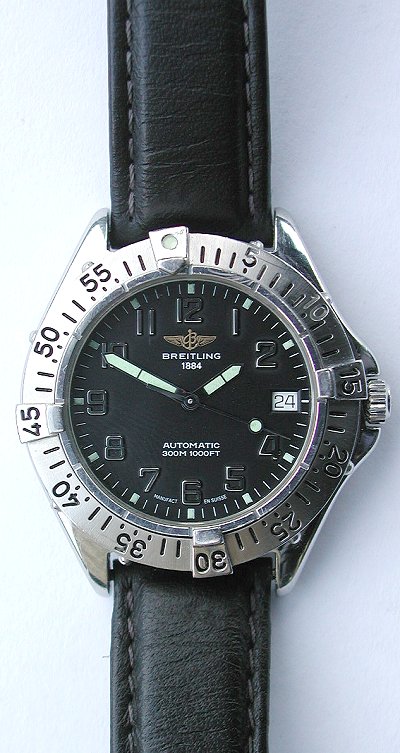 Stainless steel Breitling Colt automatic 1000 feet self-winding divers style watch. The watch with black dial, crystal glass, rotatable bezel, screw on winding crown on leather strap with Breitling steel buckle. In superb original condition. A good entry level Breitling
