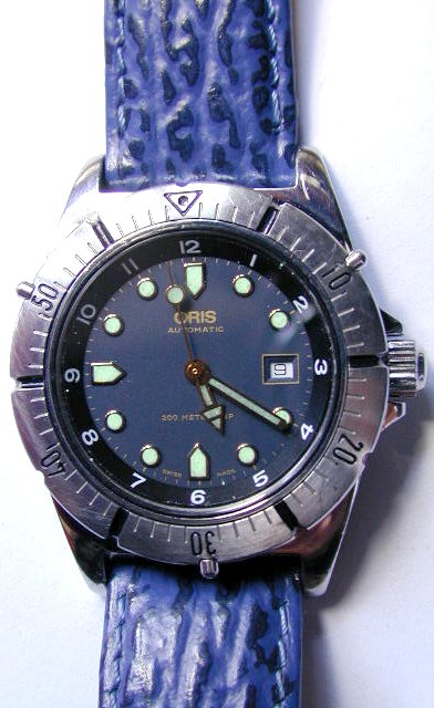 Gents rare-model stainless steel Oris Automatic 200M divers watch. The watch consisting of dark blue dial with date aperture at 3 o'clock, luminous hour markers, luminous and gilt hands, stainless steel case with rotatable bezel, screw-on winding crown, and screw-on case back. The watch is still on the original Oris blue leather strap.