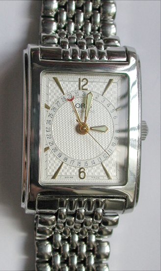 Gents stainless steel, Rectangular Oris automatic Date watch.  The watch consisting of, Engine turned silvered dial with applied gold baton and Arabic numeral hour markers, luminous and gilt hands and a subsidiary pointer hand that indicates the date in the inner date ring, Crystal glass and a stainless steel screw back case.  The watch on stainless steel Oris bracelet.  This watch appears to have been hardly used and comes complete with Oris booklets and the original Oris box.