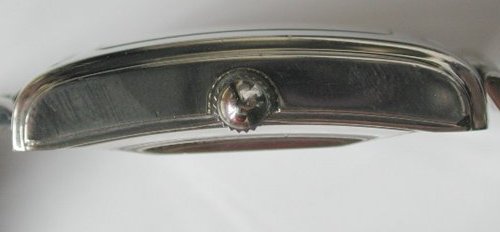 The watch with engine turned silvered dial with applied rose-gold arrowhead hour markers. The watch with extra pointer and showing the date on the outer edge of the dial, Crystal glass applied rose-gold bezel, Steel case with screw on winding crow, Glazed back with which you can view the movement.