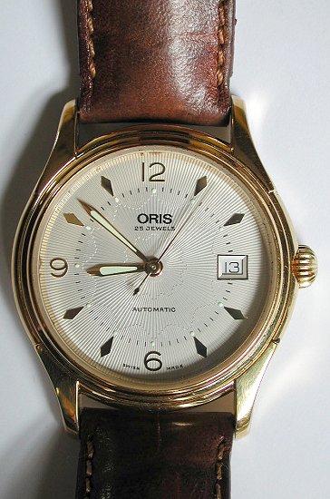 Gents oversized 18 carat gold electroplated Oris automatic wristwatch. The watch with engine turned silvered dial with date aperture at 3 'O' clock and luminous and gilt hands,crystal glass and 25 jewel automatic self winding movement. This is one of the nicest Oris's I have seen in terms of style. This watch is in virtually unused condition
