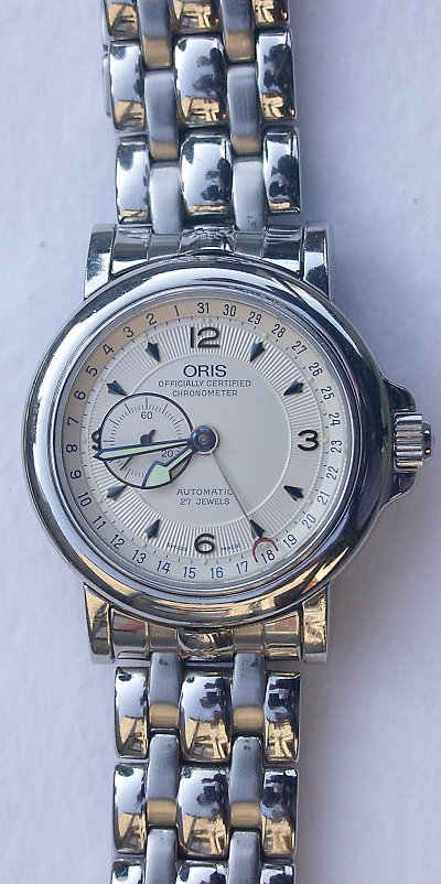 Rare Gents 27 Jewel Oris automatic officially certified chronometer Bracelet watch.  The watch with eccentric seconds dial , glazed back, Oris bracelet. These are fairly rare to find and this one is in excellent condition. The bracelet size is for a small to medium sized wrist