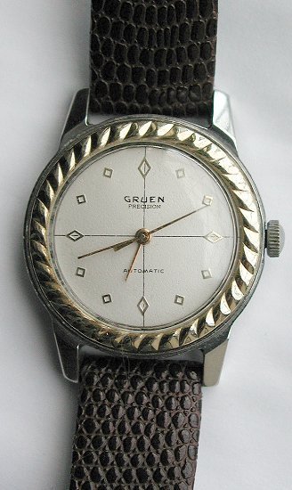 Vintage 1950'S stainless steel Gruen Precision Automatic self-winding wristwatch with unusual gold filled "ribbed" bezel. The watch with silvered dial with applied gold diamond shaped hour markers, gold hands, self winding automatic movement housed in a stainless steel screw back case, a lovely looking unusual vintage watch.
