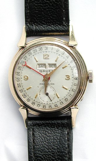 Vintage 1950'S steel and gilt Gruen triple calendar hand wound mechanical movement. The watch with original silvered dial with 2 windows below the 12 '0' clock hour marker , one showing the day and the other showing the month, the date is indicated on the outer edge of the dial by the red hand, subsidiary seconds dial at 6 '0' clock,gold filled case with stainless steel case back, a lovely complicated classic watch by a well known maker in superb condition