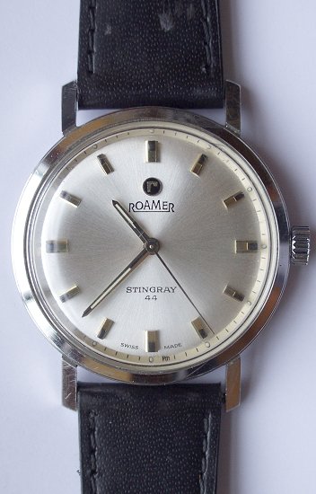 Vintage 1960'S hand-wound Roamer "Stingray 44" stainless steel watch with the original box with the original Roamer box. This watch is in hardly used condition and rare to find still with its original box