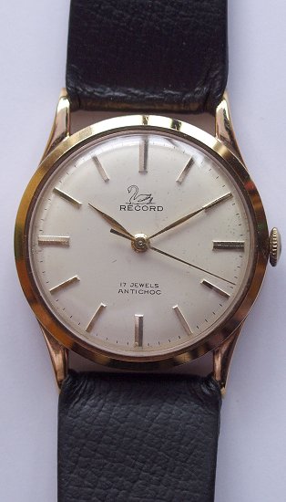 Classic 1965  solid 9 carat gold Record hand wound mechanical wristwatch . The watch with silvered dial with applied gold baton hour markers on black leather strap. The brand Record was produced by Longines so are of excellent quality