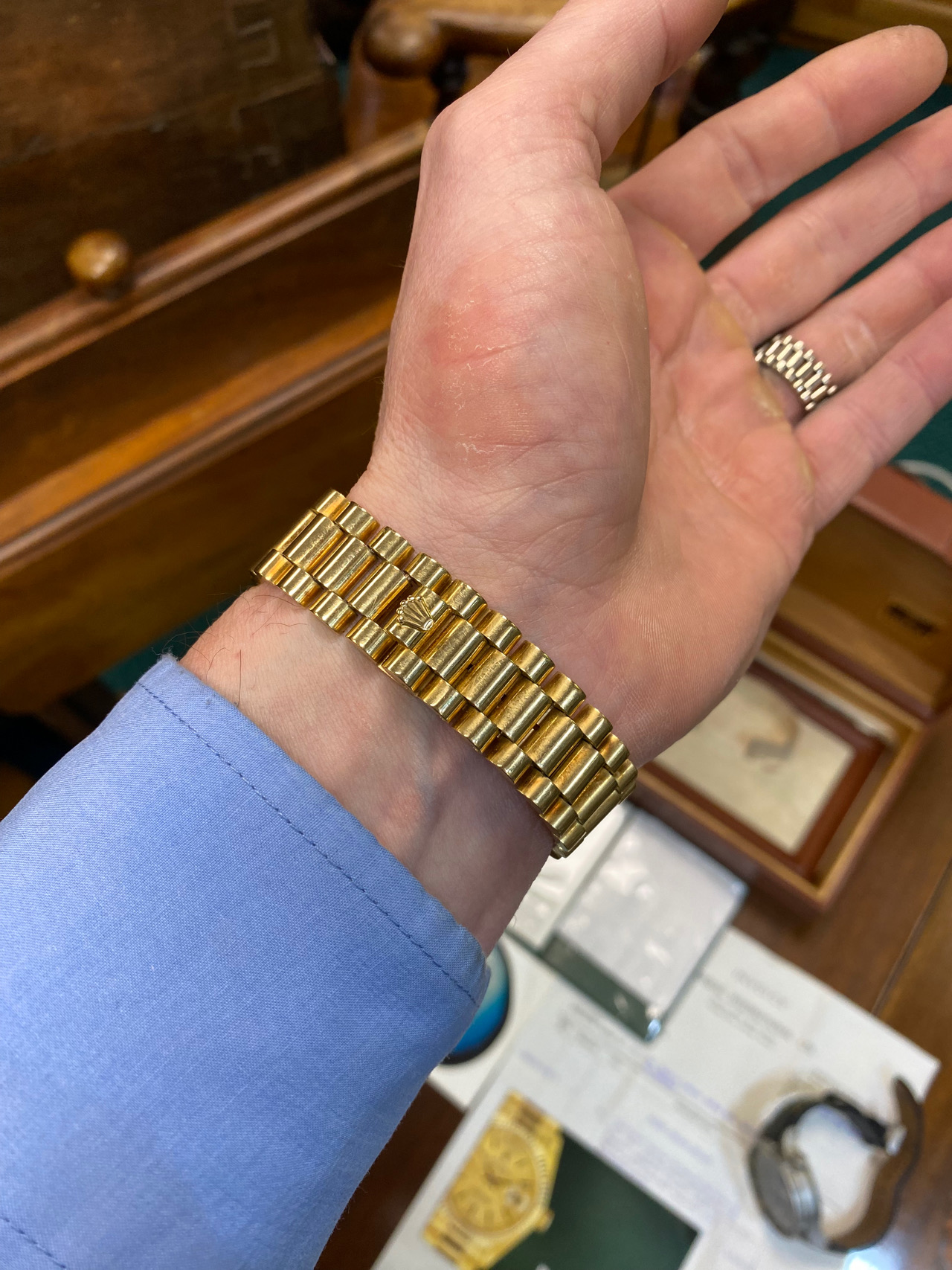 Gents Fabulous very crisp and original Rolex Oyster Speedking dating from 1949 model no.5056, this is a watch we sold around 15 years ago and were glad to take it back in part exchange for another watch we had and we originally bought it from the original owner who bought it from Hancocks in Manchester in 1951 and when we sold it 15 years ago we sold it with the original hand written receipt from hancocks the cost then was 20 odd pounds unfortunately in the 15 years the past keeper has had it this receipt has gone adrift which was a shame. This unlike most Rolex of this age hasn't been "done up" polished up or messed with , it's a real find really even has the very desirable dome top Oyster patent winding crown which are very desirable, original everything this apart from a new strap  , please note these are quite a small watch up to most nowadays but until the mid 1950s gents watches were quite small